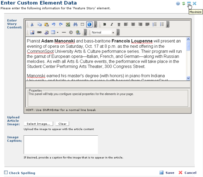 Consult your CommonSpot site designer, developer, or administrator for details on completing Custom Element forms. Note that you can expand the RTE component of any Custom Element to full-screen size.