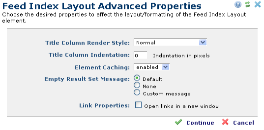 The Feed Index Layout Advanced Properties dialog is opened from the Feed Index Layout Properties dialog by clicking the Advanced button.