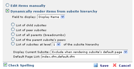 You can enter Link Bar entries manually or generate them automatically. Check Dynamically render items from subsite hierarchy to view additional options for defining criteria for generating links.