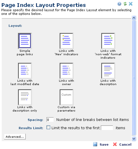 icon and select Layout to open the Page Index Layout Properties dialog. Note that you must have design privileges for the page or template you are modifying. CommonSpot provides eight different layout properties, seven of which are standard and one that allows further customization.