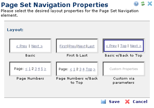 Choose from the list of six layout options the one that best suits your needs. Clicking the sixth option will open the Custom Page Set Navigation Properties dialog where you may choose various options for rendering the Element.
