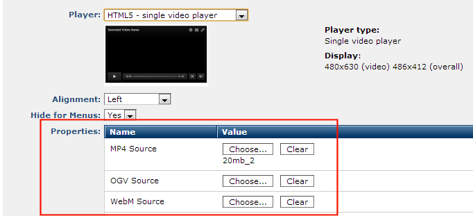 Properties: Provides options to view, change, or choose a multimedia file compatible with the current player, and optionally set output height and width and other attributes. Properties are service-, type -, and player-specific and will vary according to selections made for the preceding fields in this dialog. For example, HTML5 selections will display the following additional source options.