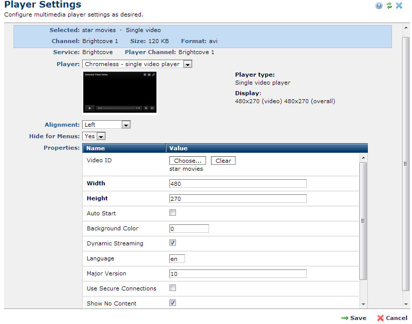 Once you click Save, CommonSpot displays a preview image of the player window and controls, along with player type, dimensions, layout, and player-specific properties.