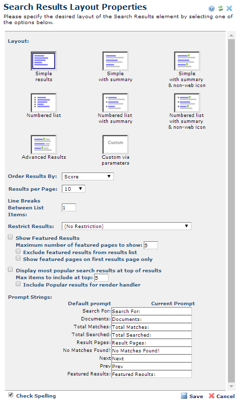 Prompt Strings: You can optionally customize label text for eight categories returned in search results, including Featured Results. By default, CommonSpot displays the following: