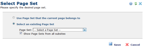 To see a list of all page sets in the site, check Show Page Sets from all subsites. The dropdown refreshes to show a list of all available page sets.