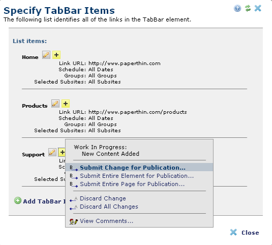 When submitting the Tab Bar Element for publication, you can submit each link entry individually. On the page containing the Tab Bar Element, click a TabBar Tool icon and select Tab. This will open the Specify TabBar Items dialog, which shows work in progress