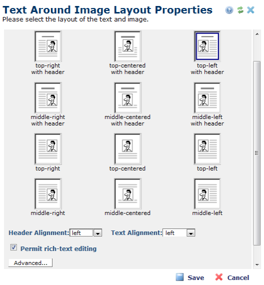 In this dialog, you may select from twelve layout options. With these options, you can choose the position of the image relative to the text block and if it includes a header.