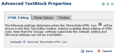 Click the Advanced button to open the Advanced TextBlock Properties dialog in which has three tabs: HTML Editing, Paste Options, and Toolbar. These options will be available to authors when they add to and edit the text for this Element.